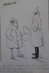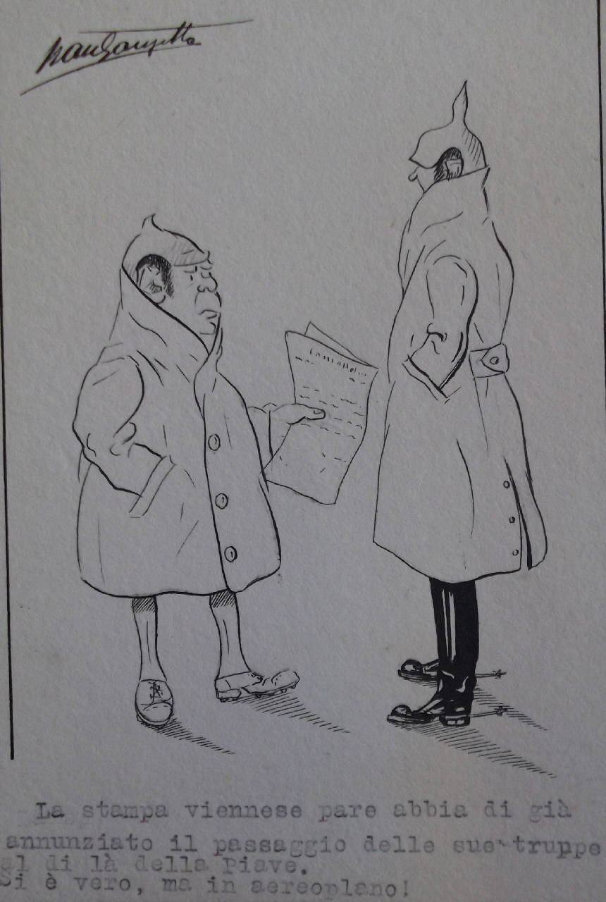 - NOTIZIE STORICO CRITICHE Reca in basso:\n"La stampa viennese pare abbia di già \nannunziato il passaggio delle sue truppe\nal di là della Piave.\nSi è vero, ma in aereoplano!"\nLe caricature a firma Mausanzetta erano probabilmente destinate ad essere pubblicate sui periodici del tempo, forse anche sui "Giornali di trincea". Lo lasciano supporre queste vignette, adatte per la stampa sia per dimensioni che per tipologia. \nNon vi è tuttavia riscontro rispetto a questa ipotesi, lasciando aperto lo studio su questo disegnatore, dalla vena felice, e sul ruolo svolto dall'illustrazione nel periodo bellico.