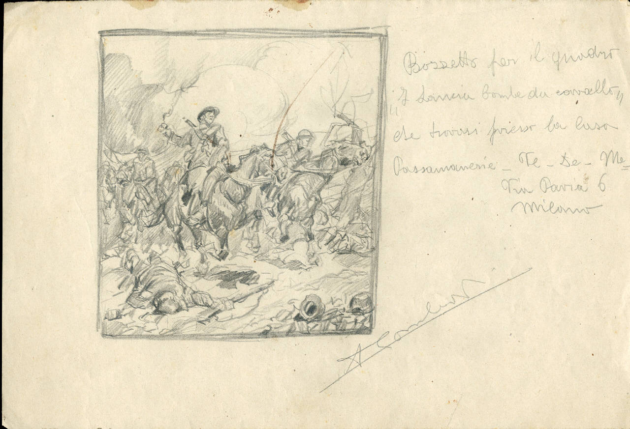 Bozzetto per il quadro "I lancia bombe da cavallo" che trovasi presso la casa Passamanerie- Ve_ Fe_Me_ via Pavia 6 Milano