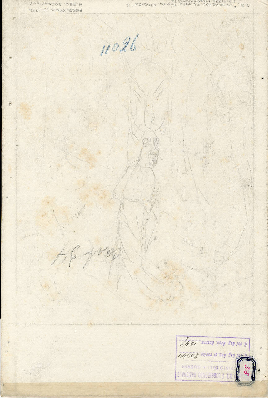 - NOTIZIE STORICO CRITICHE Il foglio al verso reca in basso a sinistra l'adesivo delle Cartiere Pietro Milani, Fabriano (Italia) con il n.546, al recto è presente un piccolo cartiglio con numero 38.\nAl verso del foglio compare il disegno a tempera con segnatura Prez. XX s. p. 35