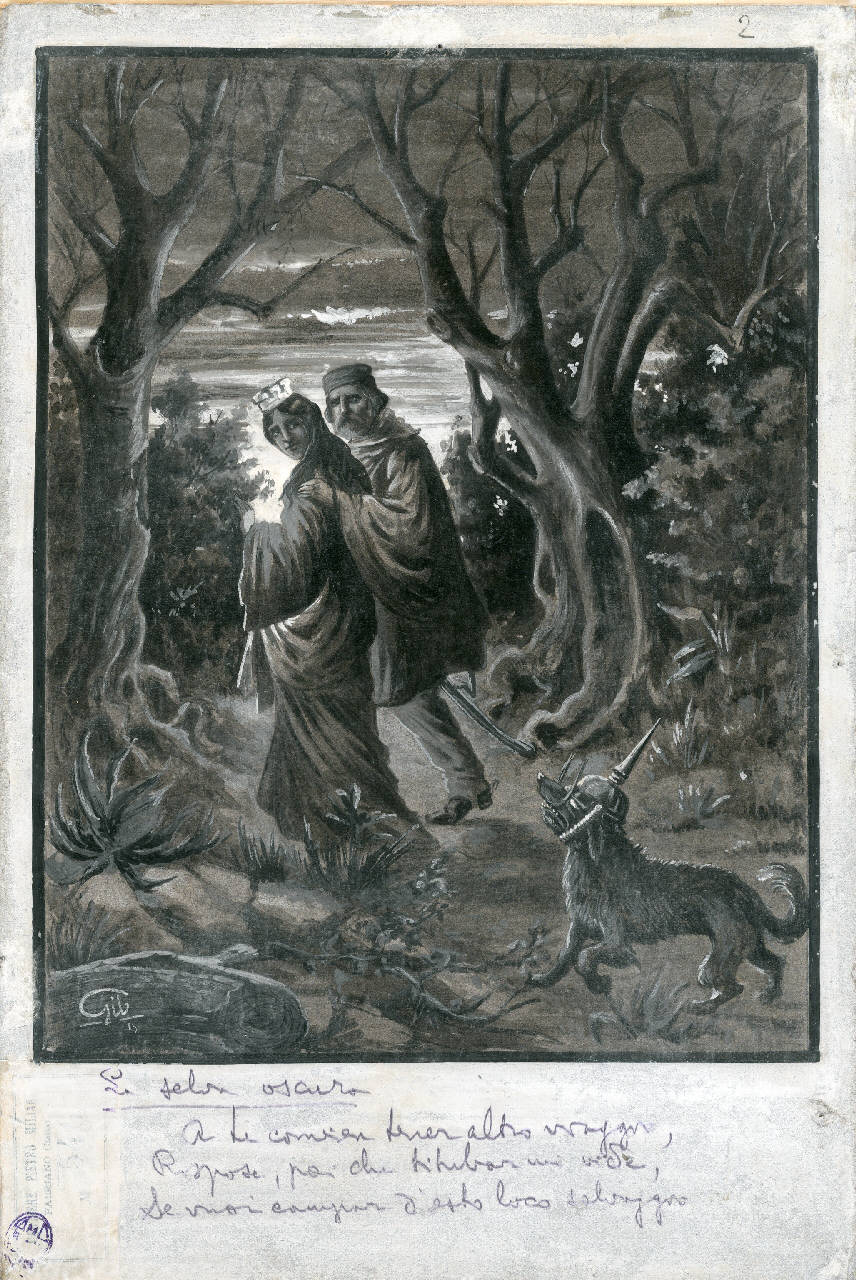 - NOTIZIE STORICO CRITICHE Il disegno rappresenta Garibaldi che sottrae dalle grinfie di un cane famelico, allegoria della Germania riconoscibile per il tipico elmo tedesco, l'Italia. Garibaldi conduce fuori dalla selva oscura, simbolo della Triplice Alleanza, l'Italia come a volerla salvare dalla possibilità di aderire all'alleanza. Garibaldi assume in questo episodio la funzione di guida/salvatore, come era Virgilio nella Commedia.\n\nIl foglio reca al recto in basso a sinistra l'adesivo delle cartiere Pietro Milani con il n.546, al verso si trova il cartiglio con il numero 38 e l'adesivo con il numero 549. Si segnala la presenza del timbro della mostra del Fascismo con il numero 10275.