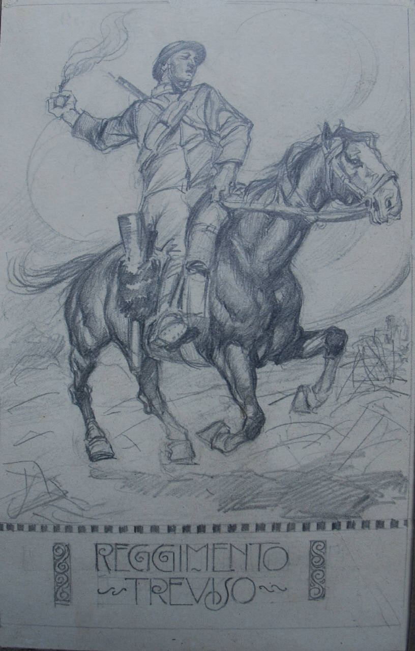 - NOTIZIE STORICO CRITICHE Il soldato appartiene al Reggimento Cavalleggeri di Treviso (28°) che fu costituito a Firenze il 1° ottobre 1909 su cinque squadroni forniti rispettivamente dal 3° Squadrone dei Reggimenti "Saluzzo", "Alessandria", "Lucca", "Caserta", "Catania". Durante la guerra 1915 - 18 formò la 734° Compagnia Mitraglieri. Il 21 novembre 1919 fu disciolto ed incorporato nei "Cavalleggeri di Alessandria". Lo stendardo è ora custodito nel Sacrario del Vittoriano, in Roma. Partecipò a diverse campagne di guerra: nel 1911 - 12 durante la guerra italo-turca fornì ad alcuni Corpi e servizi mobilitati, 7 ufficiali e 295 gregari; 1915 - 18: 1916, Monfalcone, Selz; 1918, Vittorio Veneto, Ponte della Priula, Pordenone, Tagliamento, San Giorgio della Richivenda, Carpeneto.