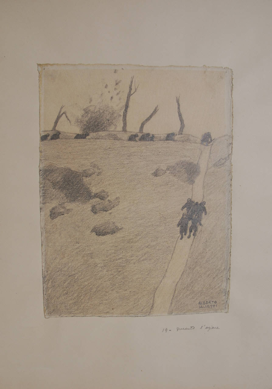 - NOTIZIE STORICO CRITICHE Tavola 19 di una serie eseguita sul fronte dall'artista. Il foglio era in origine conservato nella Cartella 35 del Archivio di Storia Contemporanea già Archivio della Guerra.