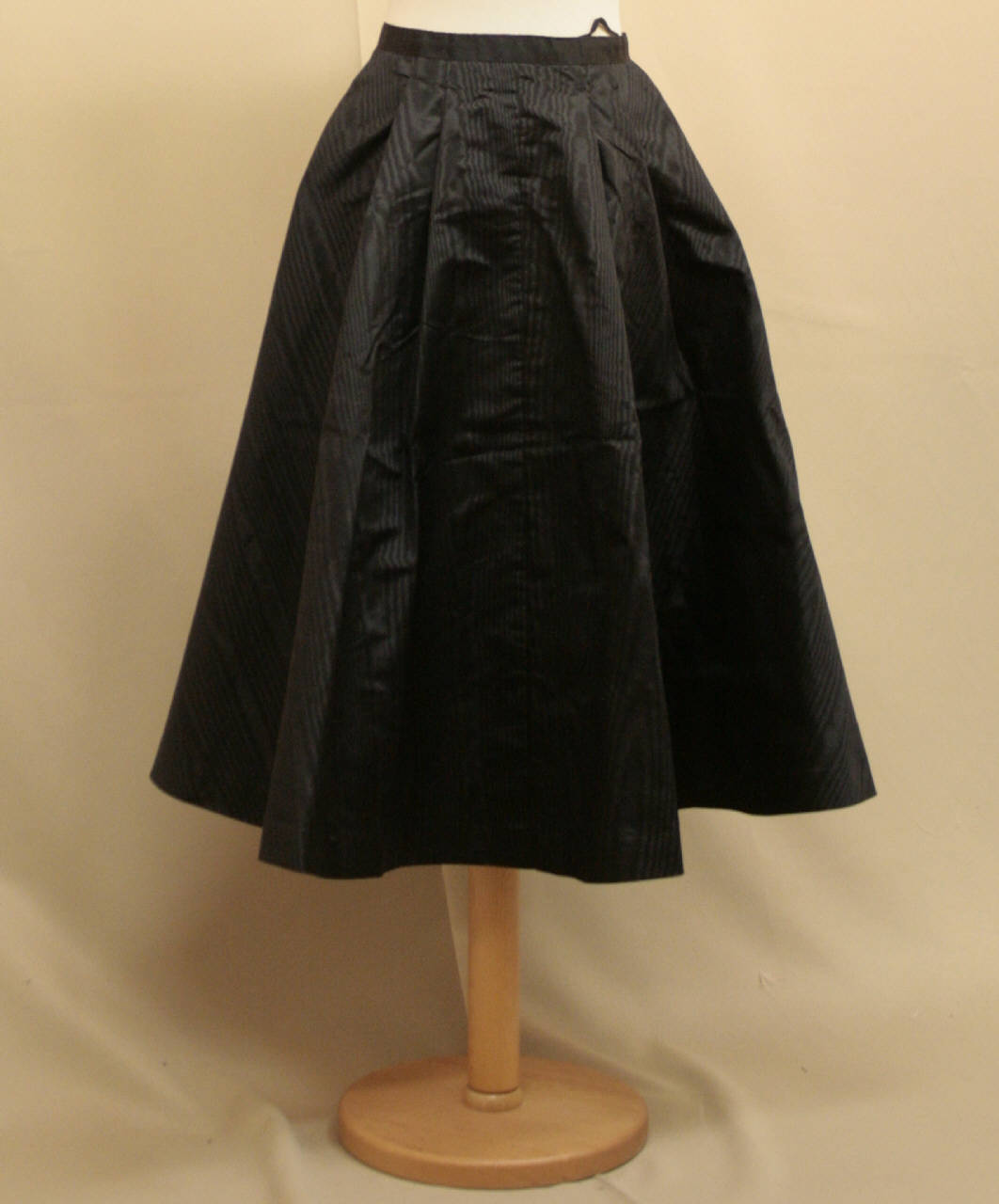 gonna a mezza ruota, in due teli con gheroni, lunga al polpaccio, in gros maezzato nero. Sul davanti, al punto vita, quattro pinces simmeriche aperte. Cinturino co ganci e apertura posteriore centrale con cerniera.