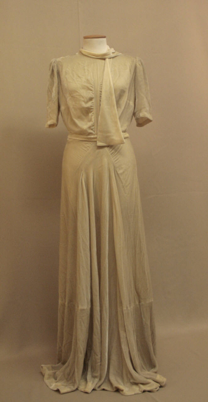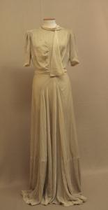 abito lungo in velluto avorio. Corpino girocollo, reso morbido sul davanti da arricciatura verticale centrale. Maniche al gomito, arricciate alla spalla e sostenute da spallini interni. Gonna in due teli sbiechi e inserto svasato al centro davanti, sagomato a punta verso la vita. I teli sono completati da una balza in sbieco. Apertura centrale posteriore con cerniera e nastro stringivita.\nL'abito è coredato da cinturino e fusciacca con estremità allungate.