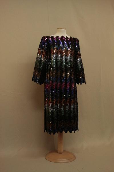 Abito dalla linea dritte, con maniche lunghe dritte, scollo a basca con orlo frastagliato, come l'orlo; spacco su un fianco. E' confezionato in taffetas nero ricoperto di paillettes dsposti in fasce a zig-zag (viola fucsia, grisio, senape, verde). Pala sostenuta da imbottitura
