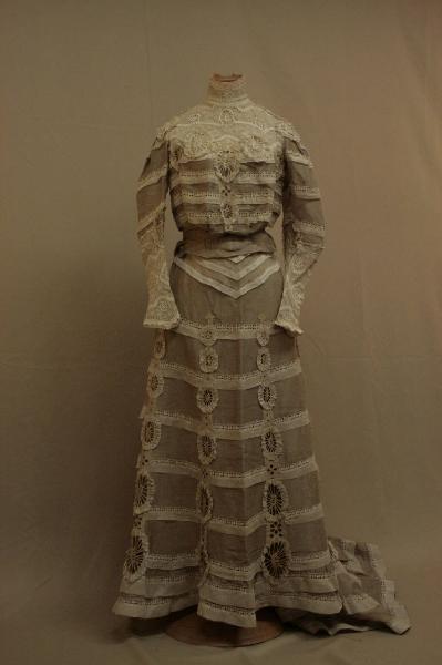 Abito in due pezzi in tala (ordito seta e trama lino) nocciola. Blusa con alto collo rifinito in organza rosa (sostenuto da cinque stecche) e guimpe in pizzo di cotone, doppiato in organza; busto molto morbida sul petto grazie a pieghe, in taffetas nocciola con falsature in merletto écru, taglio in vita acui si unisce una corta baschina. Dorso con la stessa ripartizione del dritto, con chiusura centrale completa, formata da dieci ganci con asole in filo pr il colletto e guimpe e quatrto bottoni in madreperla e due canci per il busto. Manica arricciata in taffetas noncciola e falsatue in merletto, con tagli all'altezza del gomito, a cui si collega la parte inferiore, in pizzo bianco, aderente e con polso ad imbuto, doppiata in organza e ulteriormete impreziosita da una applicazione a ricamo a forma di ruota raggiata. All'interno, le pieghe della zona anteriore del busto sono trattenute da tre fettucce. Gonna lunga svasata, a più teli, con falsature disposte a triangolo nella zona del bacino e quindi in orizzontale, dove sono sovrapposti a falsature verticali, ornate da ruote raggiate; lungo strascico sul dorse, creat da pieghe e da gheroni; allacciatura al centro, in vita, mediante ganci