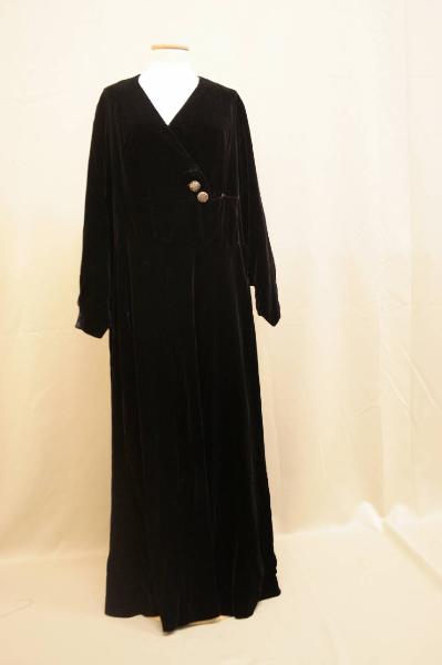 Abito lungo in velluto nero, scollo a V incrociato sul petto ce prosegue fino al taglio in vita, baschina tagliata all'altezza dei fianchi e gonna lunga e svasata; dorso con taglio verticale che dalle spalle procede sino all'orlo, taglio in vita e sui fianchi. Manica fantasia lunga con polso stretto e spacco chiuso da tre bottoni e asole in seta, decorata da un ricco drappeggio nella zona del gomito. Chiusura asimmetrica che dalla scollatura, segue l'andameto della baschina ed è chiusa da ganci e automatici. Due bottoni gioiello con strass. Busto foderato in raso di sta nera