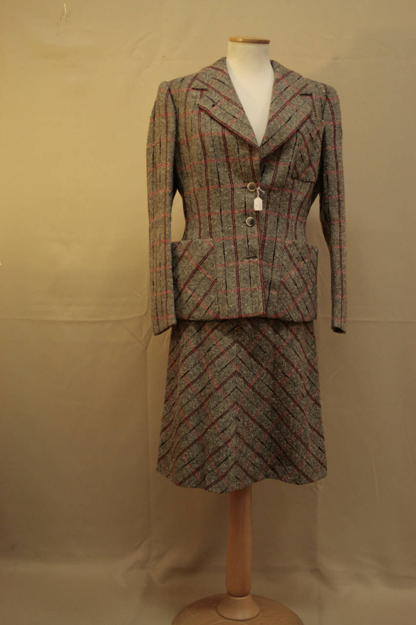 Tailleur femminile in diagonale di lana quadrettato (fondo grigio e quadrettatura rossa e arancio). Giacca corta ai fianchi, ad un petto, modellata da pinces, tre tasce applicate, spalle imbottite e abbottonatura data da tre bottoni ed altrettanti occhielli; dorso con pinces in vita e cucitura centrale; maniche dritte in due pezzi, con spacco all'altezza del polso. Fodera in taffetas sintetico grigio. Gonna in quattro teli in sbieco, priva di fodera, con un nastro in gros nero in vita e cerniera sul fianco destro. All'interno della giacca è cucita l'etichetta.
