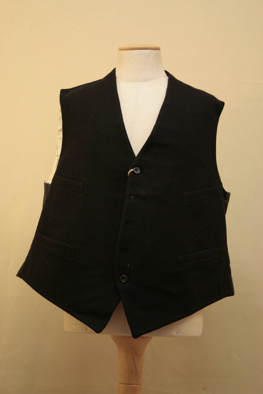 Gilet tagliato all'altezza della vita, ad un petto, con cinque occhielli e altrettanto bottoni, quattro con patta cucita, poste a destro e a sinistra. E' confezionato con diagonale di lana nero. Dorso in taffetas cangiante (ordito nero e trama verde), in due pezzi con cucitura centrale e cinturino su cui è cucita l'etichetta, con fibbia metallica. Fodera in diagonale di cotone stampato a righe. Sui fianchi sono prsenti due fianchetti in diagonale di seta nero, foderati con diagonale di coton stamoato a righe, diverso da quello impiegato per la fodera.