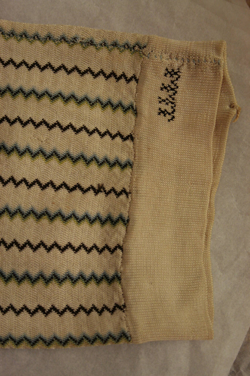Calze lunghe in jersey d seta decorate da righe a zig-zag nei toni del verde, blu, celeste, marrone ed ecru. Bordo superiore ècru ripiegato con apertura, lo stesso colore ritorna anche nella punta