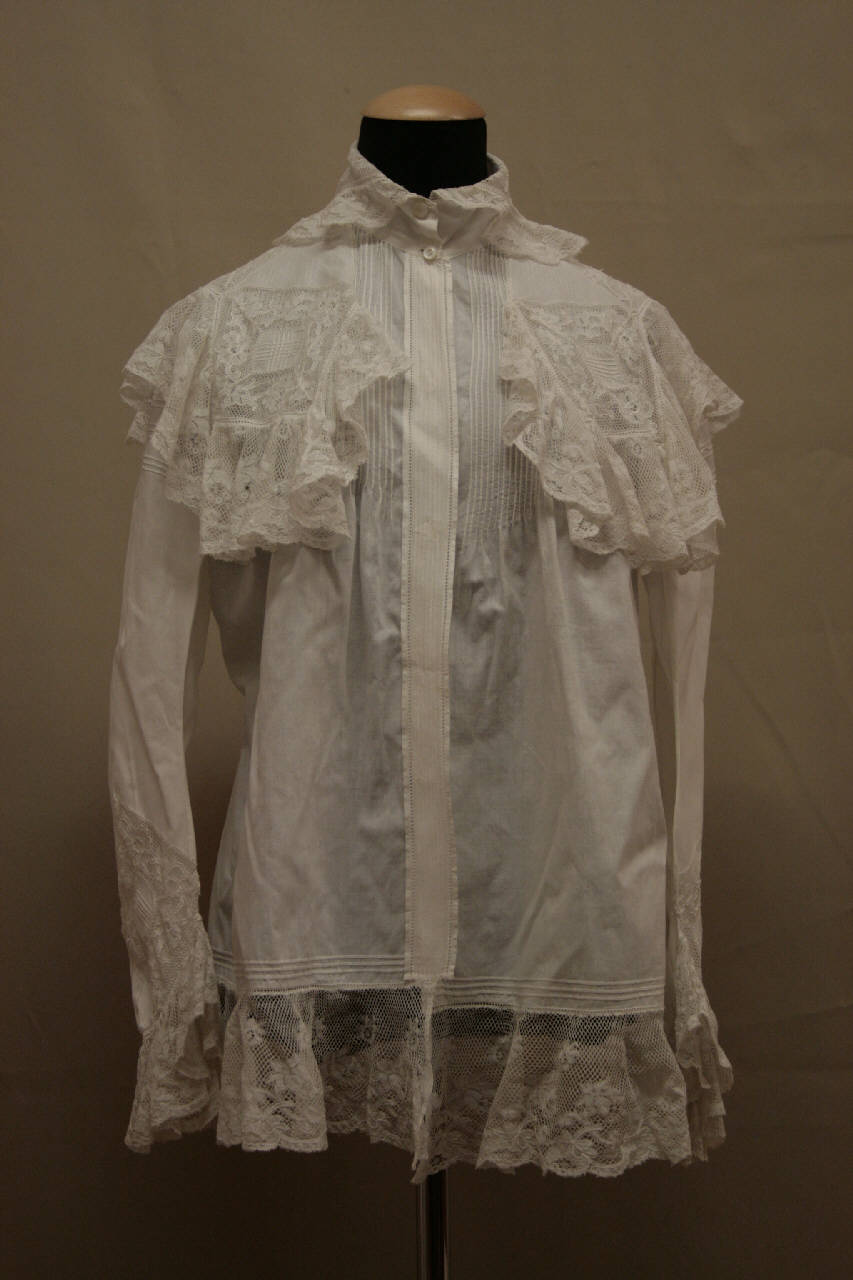 Matinè in tela di cotone bianco con collo a camicia impreziosito da un merletto decorato da motivi floreali. Lo stesso merletto è applicato vicino alle spalle e corre sullo sprone sagomato del dorso. Abbottonatura nascosta, definit da cinque bottoni in madreperla e altettanti occhielli. L'abbottonatura è impreziosita da un motivo a giorno. Il capo è reso morbido da numerose e piccole nervature che corrono anche lungo l'orlo, arricchto da una balza in merletto.Sul dorso, modellato da tagli, all'altezza della vita è posta una arricciatura che dona morbidezza la matinée. Manica in due pezzi sagomata, con pieghe all'altezza del gomito, decorata da falsature in pizzo e un polso inmerletto.