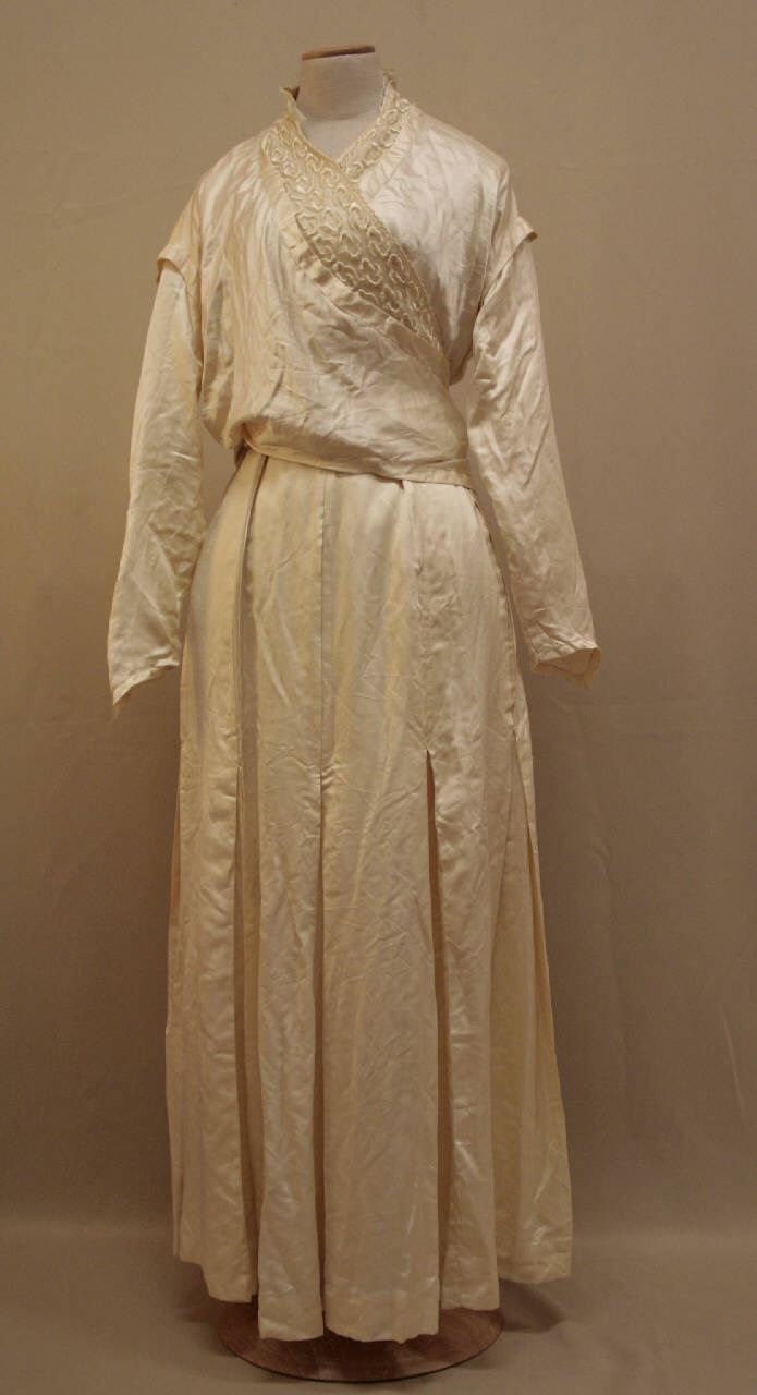 Completo in due pezzi confezionato in raso avorio. \nLa busa si sovrappone sul petto, formndo uno scollo a V, sottolineato da un ricamo a motivi stilizzati in seta bianca eseguita su organza, arricchito, posteriormente, da un colletto a fascia in tulle; i due lembi si uniscono sul retro, all'altezza dei fianchi, e uniti mediante cinque ganci cuciti su una stecca. Dorso morbido e privo di cuciture. Maniche lunghe rettangolari, con pala dritta sottolineta da una piege, che si resrtinge al polso. Fodera in tela di luno, con scollo agirocollo, appertura totale chiusa da cinque bottoni in madreperla e altrettatti occhielli, alto cinturino in vita, chiuso da un gancio, a cui si unisce la falda in sbieco, che lambisce i fianchi.b Gonna linga mossa da otto pieghe molto profondo, con alta cintura che, sul retro, è modda da pieghe e sostenuta da un alto nastro in gros. LA gonna è chiusa posterirmente, al centro, da dodici ganci, tre dei quai posti sulla cintura.