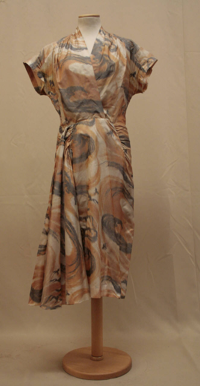 Abito con scollo a V incrociato sul petto e montante sul dorso, busto modellato da pinces, arricciatra che parte dalla linea delle spalle, maniche a popistelli, taglio in vita a cui si unisce la gonna, mossa da drappeggi sul fianco sinistro e impreziosito da ina gala a mezza ruota, applicata sul fianco destro, dove è anche inserita la cerniera. Dorso con taglio in vita. Lunghezza sotto al ginocchio. Sono presenti passanti in filo per una cintura. L'abito è confezionato in taffetas stampato con un motivo marmorizzato nei toni del grigio e dell'arancio.