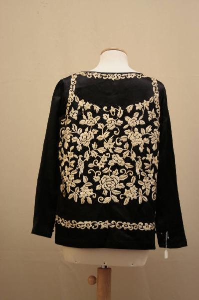 Blusa in raso nero, linea dritta, scollo a barca, modellata da pinces, lunga ai fianchi con orlo dritto, con due asole in filo con bottone al finco, in prossimitità dell'orlo, maniche lunghe dritte in un pezzo, con due bottoni al polso, chiusi da asole in filo, per stringere il fondo manica. La blusa è coperta da un ricamo in seta avoro che delinea elementi vegetali esotici e che sembra suggerire n prezioso glie