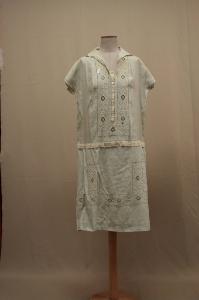 Confezionato in tela di lino verde acqua, collo con punte, abbottonatura parziale, su un nastro in tela ècru, con cinque bottoni e altrettanti occhielli, vita bassa sottolineata da una citura in tela écru decorato con il fiocco, al di sotto è un taglio, gonna dritta; La zona intorno alla allcciatura e sulla gonna sono applicati tramezzi in lino bianco ricamato con motivi geometrici. Dorso in un pezzo. Cortissime manche a chimono.