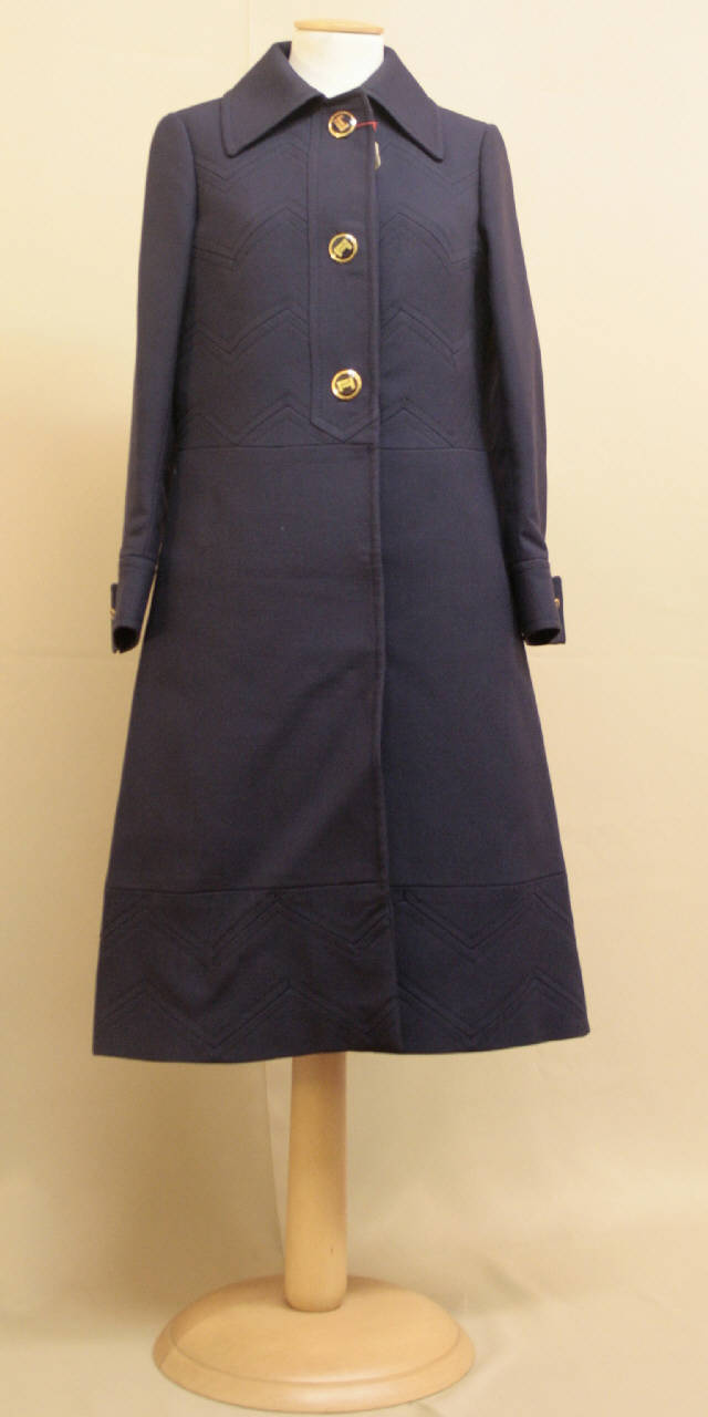 Soprabito in tela di lana blu. Collo a camicia, allacciatura ad un petto, sottolineta da una impuntura e definita da tre gandi bottni in metallo, dove è riportato il monogrammo LT, e due automatici. Il busto è percorso da cucitura a zig-zag, un motivo che ritorna anche nel dorso e sull'orlo. Taglio in vita da cui partono le falce svasate, Dorso con cucitura cwntrale con spacco terminale. Maniche in due pezzi dritte e sagomate, con polso rettangolae decorato da un bototne. Fodera in taffetas blu su cui è cucita l'etichetta.