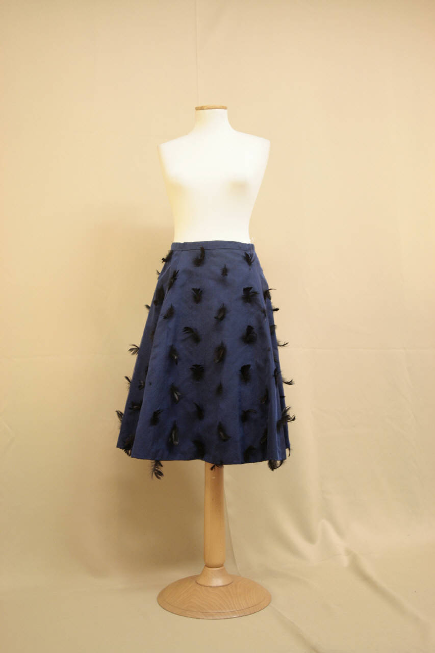 Gonna a cinque teli, svasata, lunga al ginocchio, con cinturino e chiusa da una zip, confezionata in organza di seta blu su cui sono state applicate piume di uccello e doppiata in cannettato sinetico blu.Cinturino in via e cerniera su un lato.