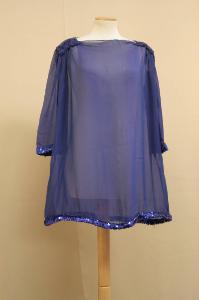 Casacca in organza blu, scollo a barca, spalle ,che trattttengono una arricciatura. segnate da mostrime ricamate con paillettes ton sur ton, la blusa, lunga ai fianchi, ha il bordo sottolineato da paillettes, stesso motivo che ritorna sull'orlo delle maniche dritte.