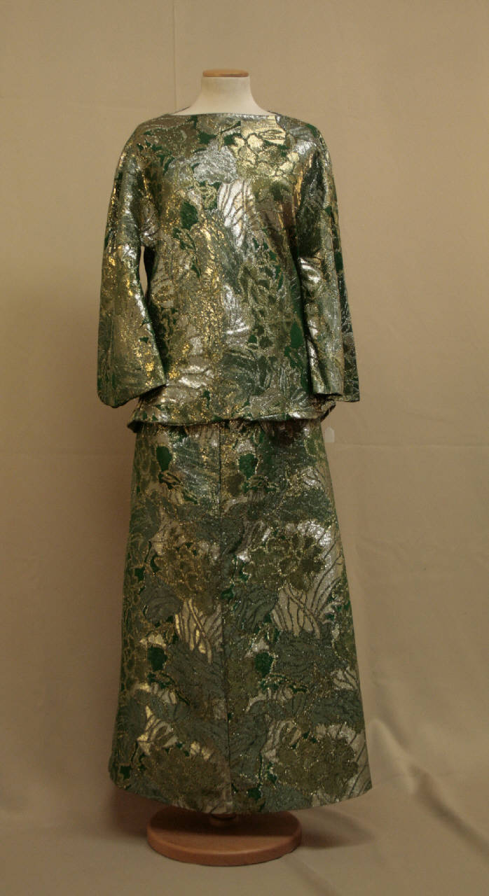 Completo femminile in due pezzi eseguito il un tessuto fondo verde e decorato da grandi fiori. Blusa con scollo a barca, manica lunga svasata a chimono. Fodera in taffetas legegro verde. Gonna lunga svasata, a tre teli, allacciatura laterale. Fodera in taffetas sintetico