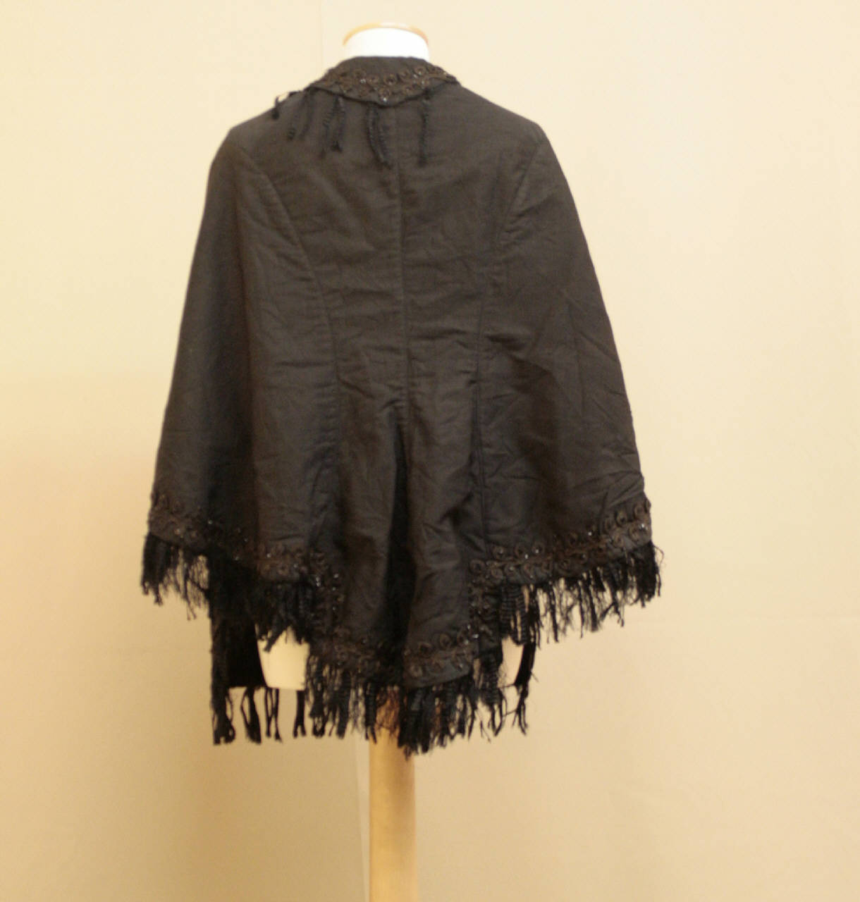 Visite in diagonale di seta nera, a sezione semicircolare, con colletto a camicia ricamato con cordoncini di seta e Iais, il bordo è impeziosito da una frangia realizzata con nastri di seta; un motivo che ritorna su tutto il bordo del mantelo; spalle sagomate da tagli e fianchetti creano volune sul dorso, Fodera in tela di lana, dove, al'altezza della vita, è stato cucito un nastro stringivita.