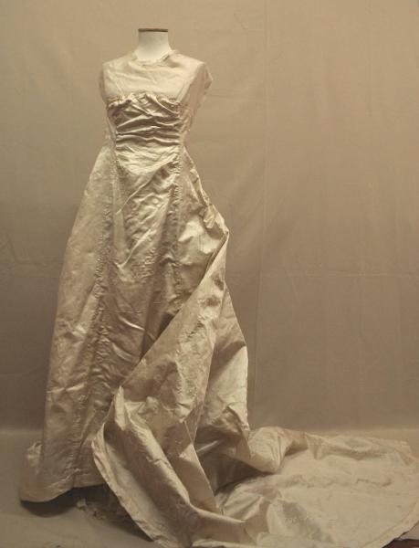Abito da sposa in due pezzi. Abito princesse, con corpino in taffetas di seta con collo a barca, rifinito da un merletto in cotone, e senza manica, busto irrigidito, all'interno, da quatro stecche fofderate con fettuccia e, all'altezza della vita, un nastri stringivita; gonna lunga e svasata, resa ampia da gheroni, con orlo impreziosito da un'alta gala plissettata, applicata sopra un'altra gala in tela di lino, con l'orlo rifinito da tre pieghe piatte e un merletto in cotone. A questo si sovrappone, da sotto il seno, la parte della gonna, svasara e lunga fino i piedi che, sul retro, forma un lungo e imponenet strascico, creato da gheroni e studiati tagli sartoriali. Chiusura data da ganci posta sul retro, al centro, uno per lo strato in raso e uno per quello in raso. Sul corpino si sovrappome un bolero con scollo a V in raso drappeggiato e bande in merletto in seta decorato con motivi floreali e con medaglioni a filet. Allacciatura sul retro, mediante ganci, al centro; maniche arricciate e drappeggiate, con polso aderente, rifinito da un merletto in cotone.