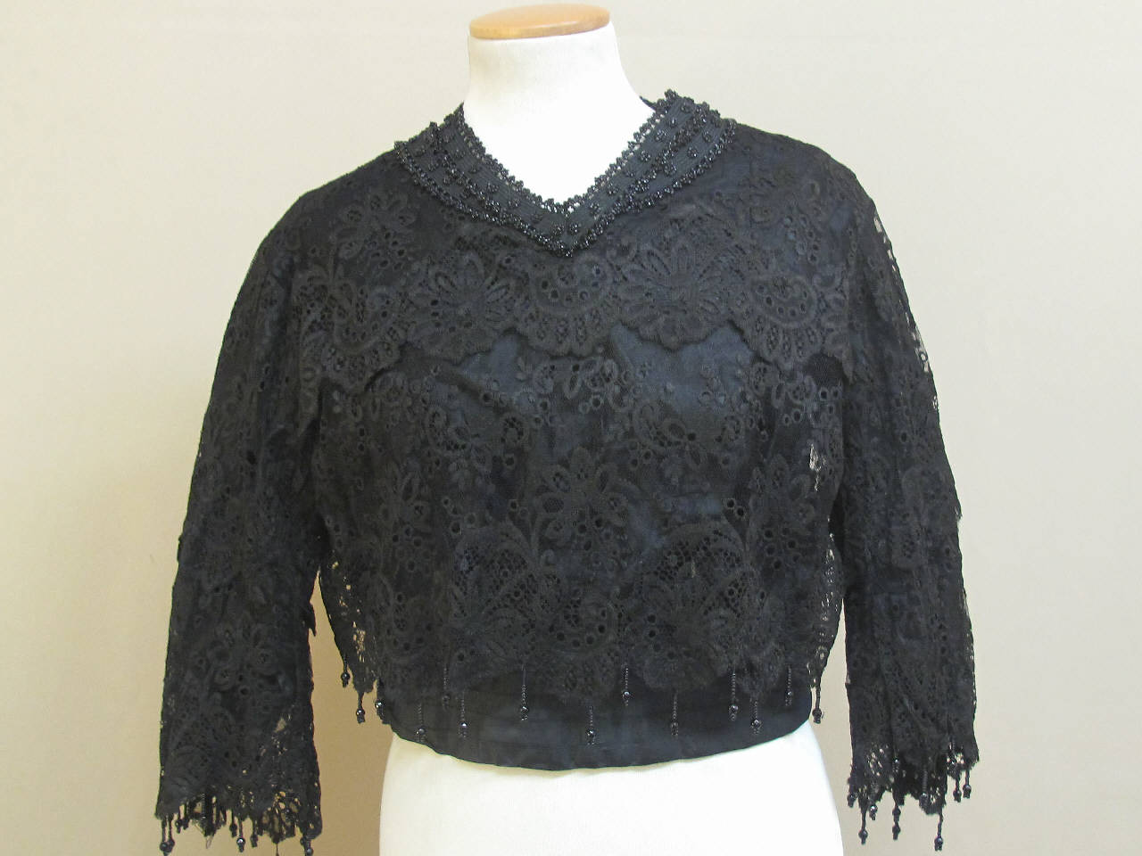 Blusa con scollo a V molto accollato, rifinito con un gallone in seta nera ricamto con jais neri, corpino inpizzo di cotone nero, con sprone dritto e maniche dritte corte al gomito; l'orlo delle maniche e del corpino sono impreziositi da briglie d jais; il pizzo continua anche sul dorso. E' appoggiato u un corino in raso nero modellato da tagli. Vita stretta da una alta cintura pieghettata in taffetas nero. L'abbottonatura è sul dorso, ottenuta mediante sei bottoni in osso e altrettanti occhielli; la cintura è chiusa da quattro ganci ed è irrigidita da una copia di stecche.