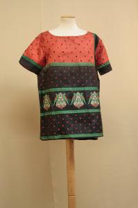 Blusa a sacchetto, con collo a barca e maniche corte dritte. E' confezonata con un pannello di taffetas stampato con bande rosse con piccoli firi blu, blu con piccoli fiori rossi. blu cn pappagalli su trali ioriti e blu con fiori rossi, ogni banda è spara dalla successiva da una cornice verde. Il panello si unisce sul davanti. Dopiato in taffetas blu.