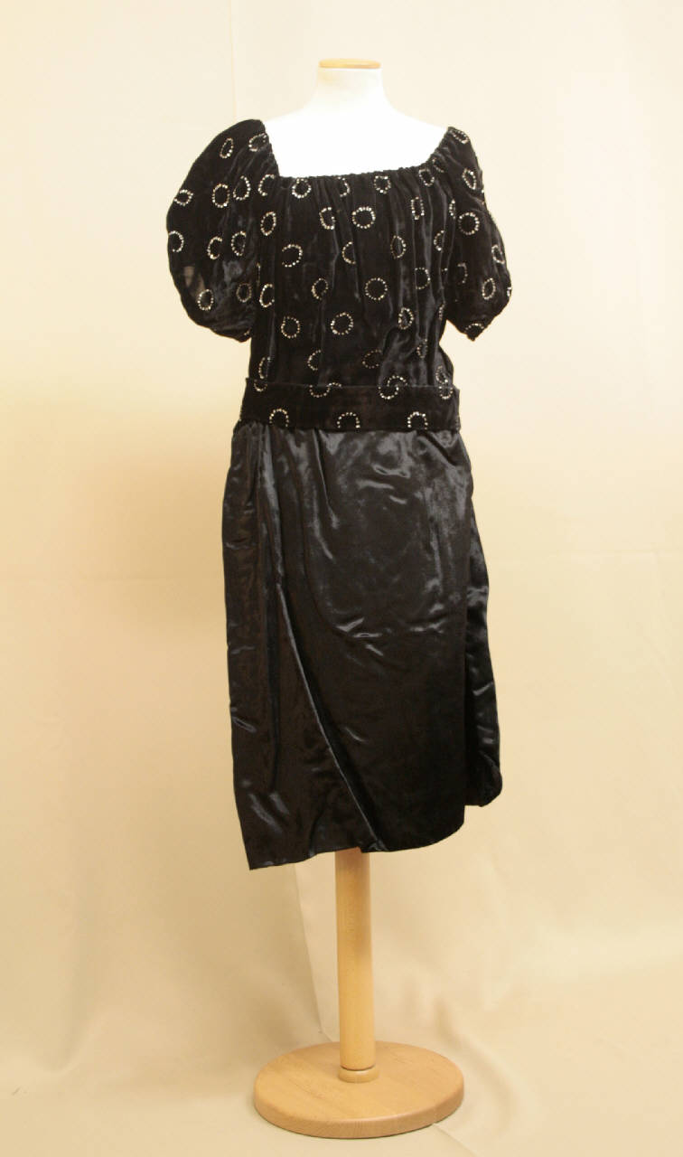 Abito corto con scollo quadrato darppeggiato e manica raglan arricciata e blusante, busto in velluto nero tagliato e ricamato con cerchi di paillettes, taglio in vita, a cui si unisce la gonna arricciata in raso nero. Una cintura in velluto completa l'abito.