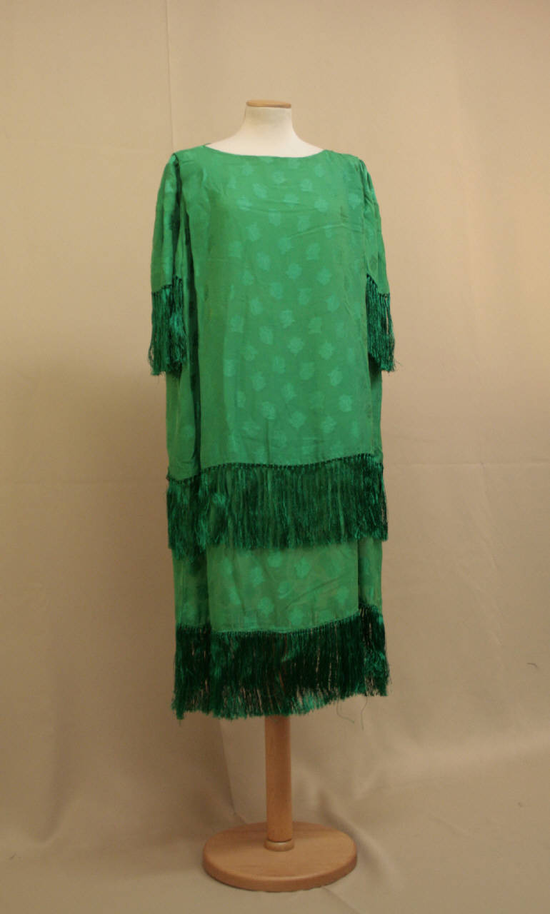 Abito a sacco confezionato in taffetas lanciato: sul fondo verde si staglaino rose create da trame supplementari verdi. L'abito imita l'effetto di una blusa portata su una gonna: il busto ha scollo a barca, spalle con una piega all'altezza della pala , maniche arricciate dritte corta rifinite con una frangia in filato sintetico verde, orlo all'altezza dl bacino, rifinito da una frangia; gonna dritta, con l'orlo sempre rifinito con una frangia. Al rovescio, la gonna è unita alla parte superiore mediante una fodera in organza verde. Le spalle sono sosenute da spalline e sono rifinite con il cinturino che serve a trattenere le spaline del reggiseno