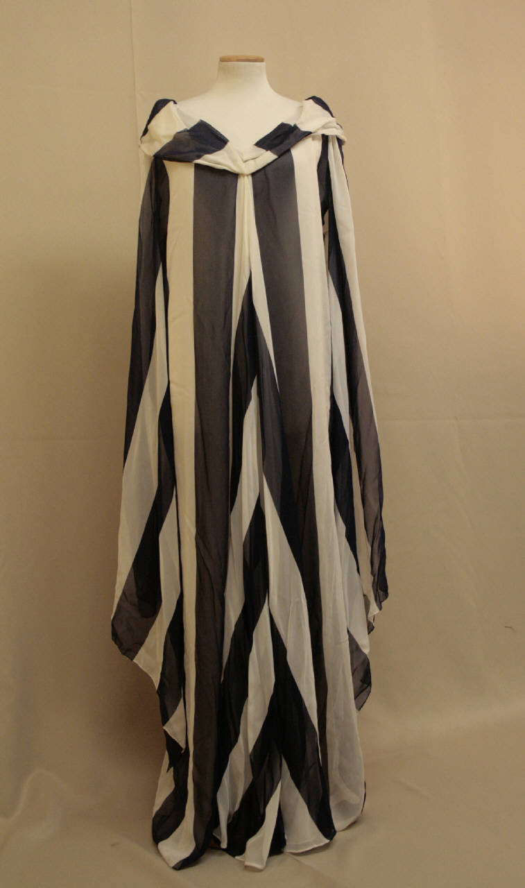 Abito svasato e lungo,confezionatoin crespo stampato a grandi righe bianche e blu, ampio scollo a barca impreziosito da un morbido collo a ciambella che crea un fiocco sul davanti, maniche svesate lunghe con spacco, dorso estremamnete ampio, con cucitura centrale.Fodera in crespo bianco.