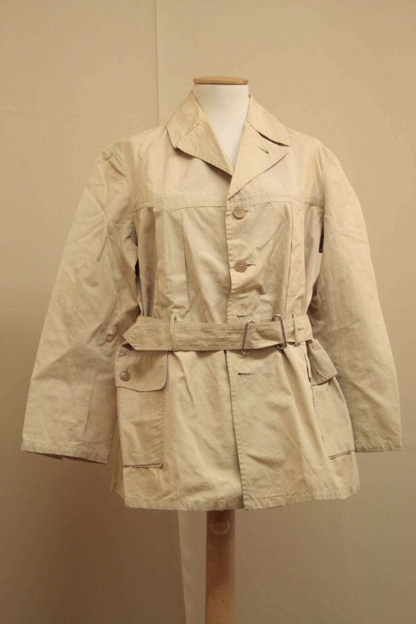 Soprabito corto, collo con risvolto, abbottonatura centrale completa, definita da cinque occhielli e bottoni.Sprone dritto, taglio in vita che prosegue anche sul dorso, e falde che accolgono due tasche applicte con patta. Dorso con sprone sagomato da cu partono due pieghe patte. Cintura nelllo stesso tessuto trattenuto da passanti. Manica drittain due pezo, con spacco al polso chiuso da un bottone. All'intero è l'etichetta.