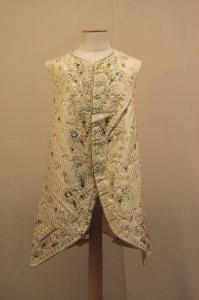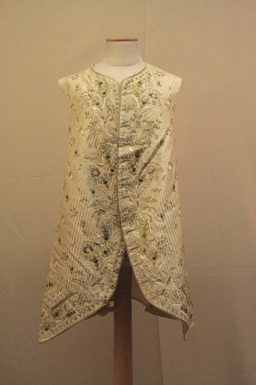 Gilet in pekin ècru ricamato a motivi floreali policromi disposti sul fondo e lungo le mostre, le falde a le tasche. Scollo a girocollo, mostre dritte dove sono undici bottoni rivestiti in tessuto e ricamati e tredici occhielli, tasca con patta sagomata. Falde sfuggenti verso il dorso con cucitura centrale quasi del tutto aperta e chiusa da cinque coppie di fettucce. Fodera in tela di lino, mentre la mostra e le falde in diagonale ècru.
