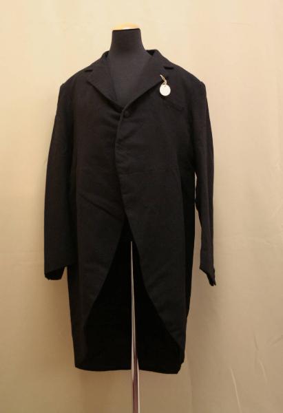 Giacca in panno di lana nero, con collo con risvolto, sul davanti è cucito un bottone rivestito in tessuto, ha taglio in vita da cui parte una pinces per modellare il capo e la falda che continua posteriormene con la foggia "a coda di rondine" unendosi sul dorso contraddostinto da tagli e dalla cucitura centrale con spacco; due bottoni segnano il punto vita. Maniche in due pezzi con due bottoni all'altezza del polso. Fodera in raso di seta nera e, per le maniche, in taffetas bianca. Due tasche interne. Sulla fodera, all'altezza del collo, l'etichetta.