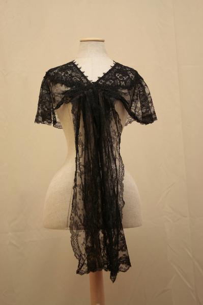 Collo piatto sagomato, in merletto nero in seta, decorato da motivi floreali, sul cui bordo corre una alta gala di un altro pizzo. anteriormente, all'altezza del petto, dove è il gancio atto a chiudere il capo, pendono due lunghe bande nello stesso pizzo della gala.