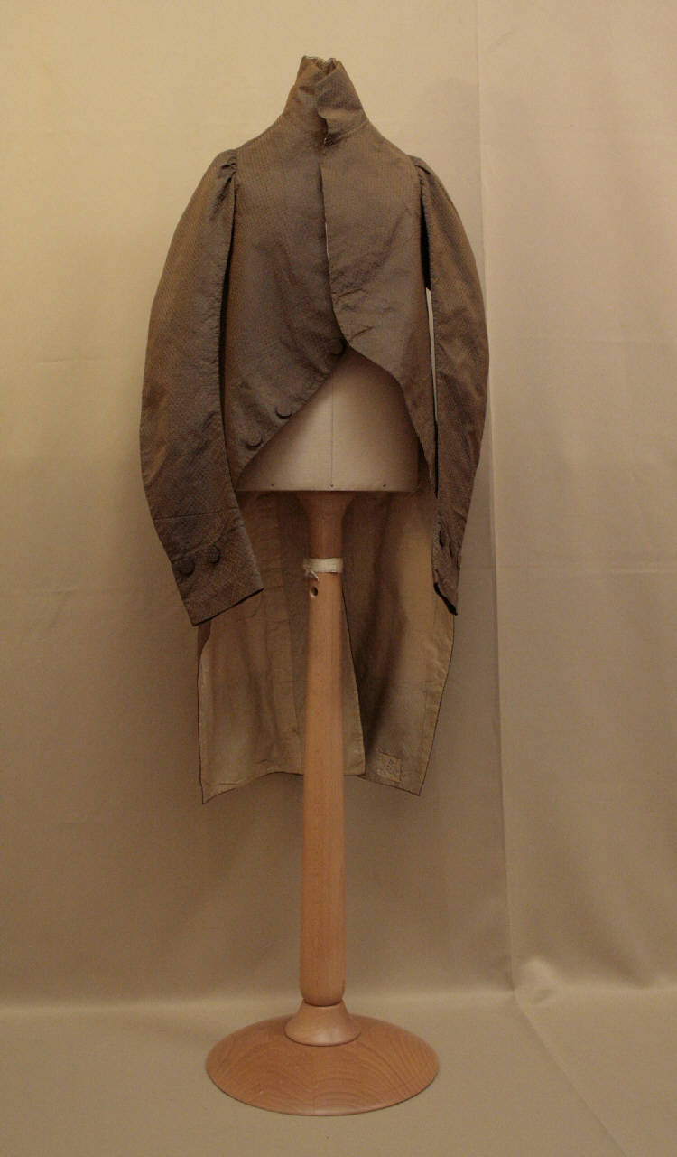 Marsina confezionata in cannetille color nocciola con piccoli decori geometrici azzurri, ottenuti con la slegatura della trama di fondo. Alto colletto a fascia, mostre molto sfuggenti dove sono sei grandi bottoni rivestiti in tessuto e due asole. Tasca con patta sagomata e decorata da tre bottoni. Falde che si riuniscono posteriormente in piegoni e spacco centrale, punto vita segnato da bottoni. Manica in due pezzi arricciata sagomata, terminante con paramani con tre bottoni. Fodera in diagonale écru
