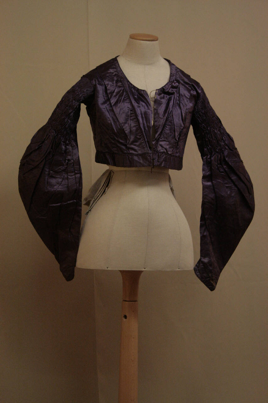 Corpino cnofezionato in raso viola, scollo con colisse, spalle leggermenre spostate sul dietro, modellato anteriormente da gruppi di tre pinces, in parte celati da una piega piatta che corre fino alla vita, segnata da un cinturino; allacciatura definita da cinque ganci e altrettanto asole. Dorsomodellato da due tagli. Manica fantasia con ricco rigonfiamento, otenuto da un fitto drappeggio che nteressa la pate superiore, a metà del braccio; polso aderente, con spacco chiuso da un gancio. Il capo è doppiato in tela di cotone nocciola.