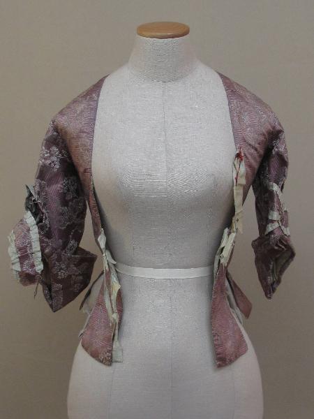 Corpino confezionato in cannettile lanciato: sul fondo percorso da minute coste orizzontali glicine, si staglia un suoso nastro bianco, da cui nascono mazzi di fiori. Il decoro è ottenuto da una trama supplementare in seta bianca. Corpino completamente aperto anteriormente, con falda lunga dritta. Il dorso, modellato da tagli e dalla cucitura centrale, ha falde lunghe, rese morbide da pieghe e tasselli triangolari. Manica en raquette dritta sagomata, con paramano a ventaglio di pieghe sotto il gomito, probabilmete irrigidito da stecche. Sul paramani è applicato un fiocco bordato con un nastro in taffetasverde acqua. Fodera im tela di lino beige. Sull'apertura anterioore erano applicati tre coppie di fettucce.