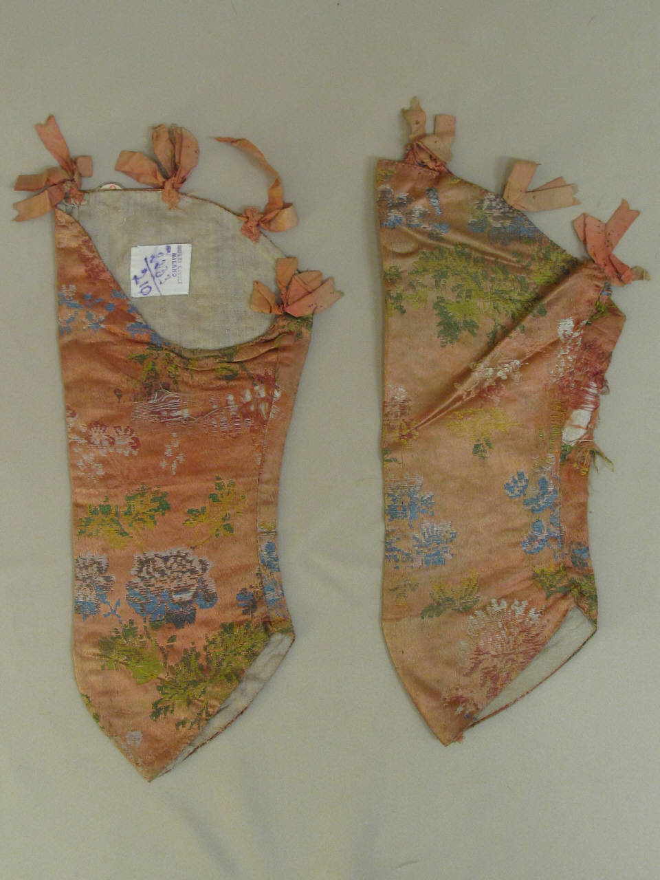 Coppia di manica in due pezzi, a tre quarti, sagomata. Confezionata in raso liserè: sul fondo salmone si stagliano tralci fioriti eseguiti con la slegatura della trama. Fodera in teal di lino écru. Lungo la pala sono cuciti quattro fiocchi in taffetas salmone