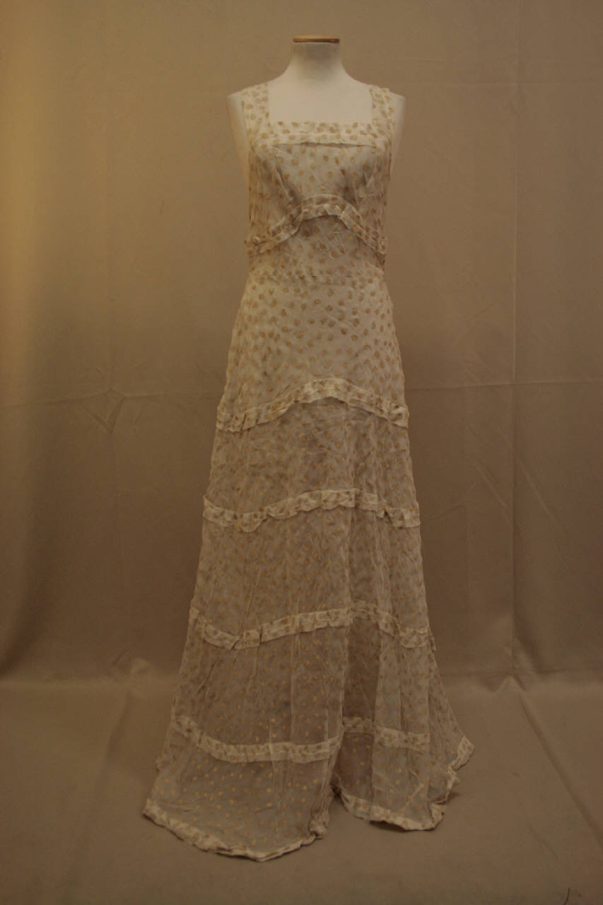 Completo femminile in due pezzi confezionata in organza stampata con piccoli frutti in color crea, disposti in apparente disordine. Abito svasato lungo dall'ampia scollatura rettangolare, milto più profonda sul dietro; punto via tagliato; Sotto al seno e sulla gonna sono applicati cinque nastri ottenuti ollo stesso tessuto; i nastro presenti sulla gonna, che nascondono le cucite che srvono ad dare ampiezza, proseguono anche sul retro. Grande cerniera plastia sul fianco sinistro. Corta giacca con collo a cinturino, apertura completa centrale, chiusa da du ganci, taglio in vita; è moellata da pincese sia anteriormente che sul dorso. Dal taglio in vita pate una picola falda dritta. Importanti maniche ricoperte di piume bianche.