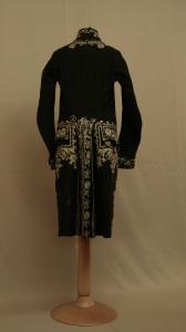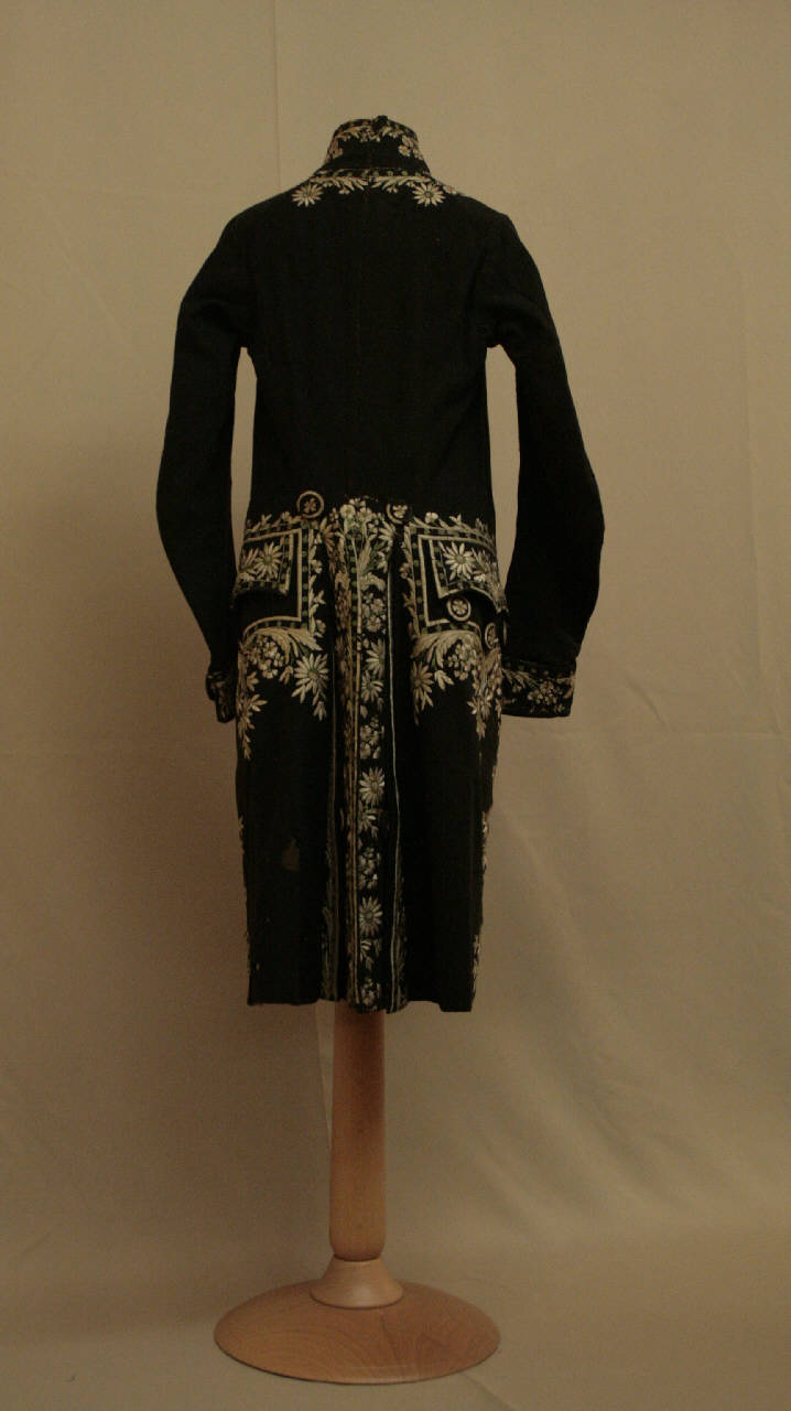 Marsina in panno nero ricamato in seta policroma a motivi floreali e in tulle ècru; alto colletto a fascia, mostre molto sfuggenti dove sono dieci grandi bottoni rivestiti in tessuto non funzionali, tasca con patta sagomata e decorata da tre bottoni. Falde che si riuniscono posteriormente in piegoni, chiusi da un bottone, e spacco centrale, punto vita segnato da bottoni. Maniche in due pezzi dritta, terminante con paramani con un bottone. La chiusura è data da due ganci e due asole in filo. Fodera in tela di lno ècru.