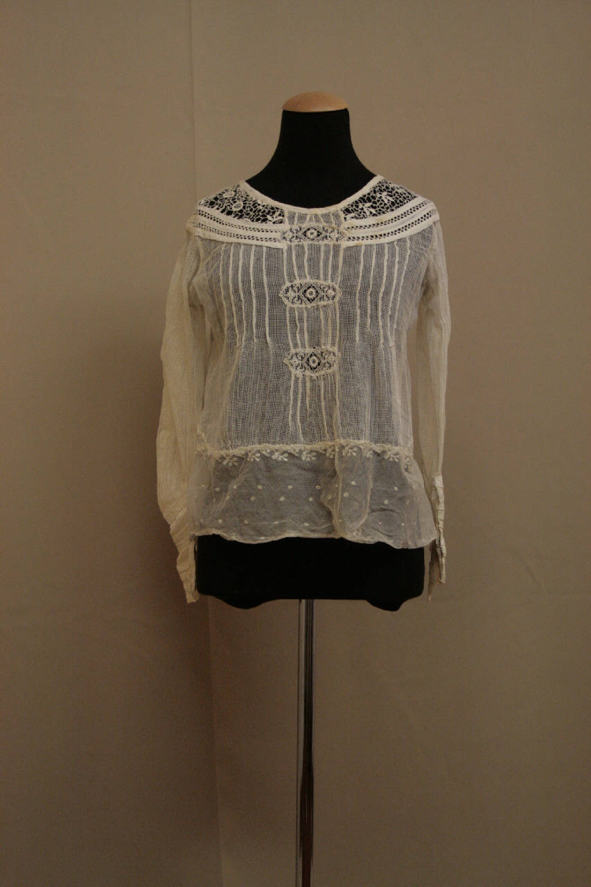 Blusa con scollo a barca e sprome sagomato in filio di cotone lavorato ad ago e inserti di tela di cotone uniti da ricamo in cotone. Blusa in filet con inserti in pizzo di cotone e, sul davanti, nervature. Dalla vita diparte una alta fascia in pizzo di cotone decorato da motivi floreali. Sul dorso è l'abbottonatura definia da un bottone a pressione e quattro in madreperla, con atrettanti occhielli. Maniche lunghe, in un pezzo, increspate all'altezza dell'alto polsino creato dall'alternanza di filet e nastri in teka di lino; il polsino è chiuso da quattro bottoni a pressione.