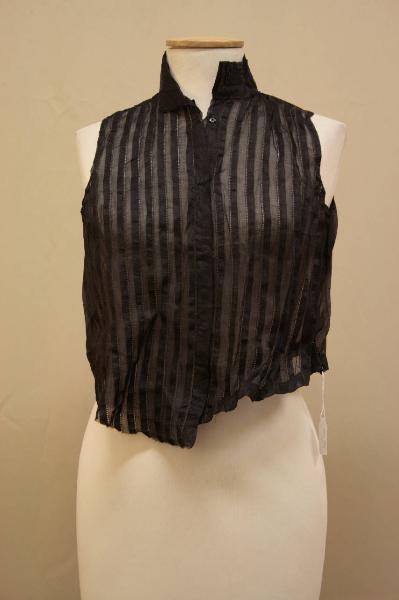 Camicia di linea aderente in organza nera. Collo a cinturino e chiusura anteriore definita da cinque bottoni a pressione. La parte anteriore è decorata da motivi di pieghe piatte, impreziosite da un ricamo a punto a giorno. Dorso ad un pezzo.