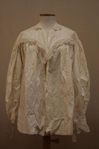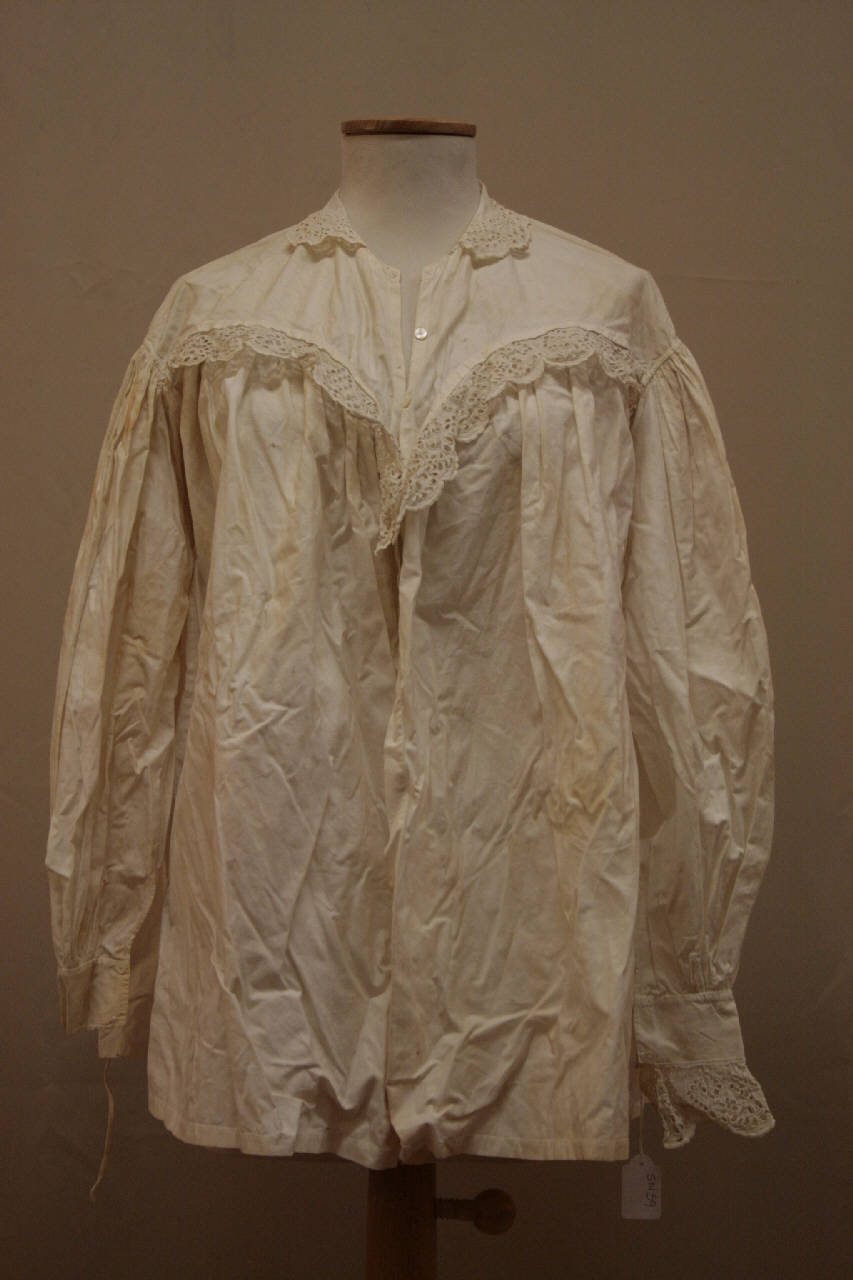 Matinèe corta ai fianchi e di forma sciolta, in tela bianca e ornata da pizzo Sangallo sempre bianco. Collo piatto con colletto in sangllo, sprione sagomato e sottolineato da voulant in Sangallo e chiuso da tre bottoni in madreperla. Dallo sprone parte una ricca arricciatura che crea morbidezza al matinee. tassello triangilare ai fianchi. Dorso in un pannello con coulisse all'altezza della vita dove passa un nastro atto a modellare il capo. Maniche arricciate termonanti con polsino ornato da una balza in Sangallo e chiuso da un bottone.