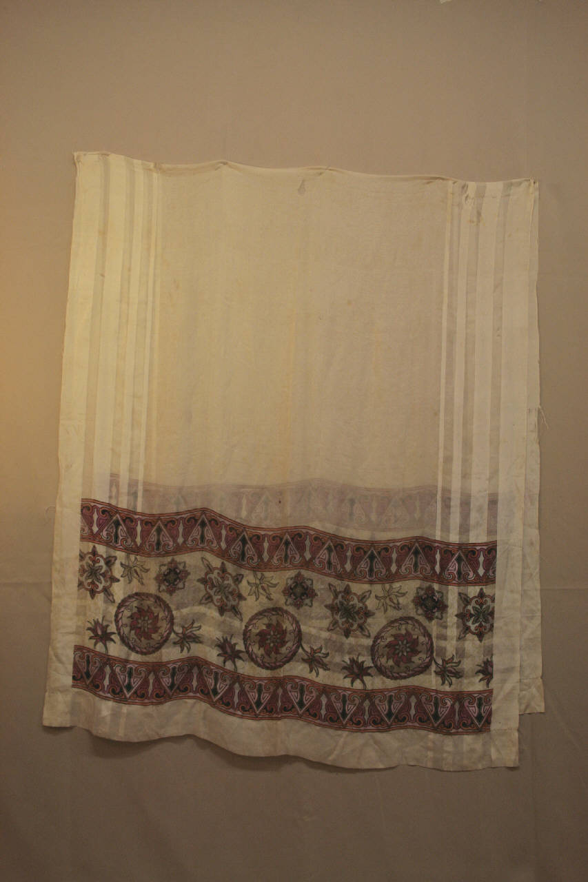 Scialle rettangolare in taffetas, con quattro bande laterali in taffetas, ma realizzate con un ordito piùspesso. Lungo i bordi orizzonatli è stampato un decoro creato da motivi mistilinei e fiori stilizzati inseriti fra due fasce definite da triangoli contraposti e motivi a spirale. I colori sono fiocati sui toni del giallo, arancio, rosso, verde e nero