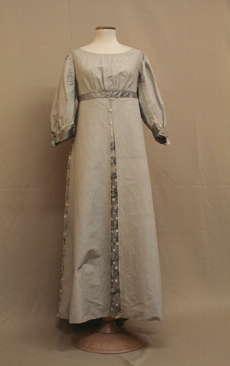 Abito confezionato in pekin con orditi in seta e trama in coto, decorato dalla contrapposizione fra righe bianche e azzurre Scollo a basca, più profonda sul dorso, rifilata da un sottle bordo in sbieco ricavato dallo stesso tessuto, busto reso morbido da una arricciatura che parte da sotto il seno, dove è applicato un nastro in diagonale grigio. Dal nastro parte la gonna svasata , in due teli uniti da inserti triangolari in garza di seta ricamata con pois di cotone e da nastri drappeggiati in diagonale grigio; moivo che informa anche i fianchi e il retro, dove la gonna forma lo strascico e dove sono presenti gheroni; il dorso del busto presenta al centro . un pannello con la garza e bordato ora di raso (frutto di un intervento recente). Maniche leggermente ricce e blusanti, con alto polso decorato da un bordo di garza e uno di diagonale drappeggiato e impreziosito da un fiocco; piccole pieghe donano morbidezza all'attaccatura della pala. Allacciatura centrale parziale definita da sette ganci, per il busto, e altrettanti automatici per la gonna. Cuciture rifinite con fettucce