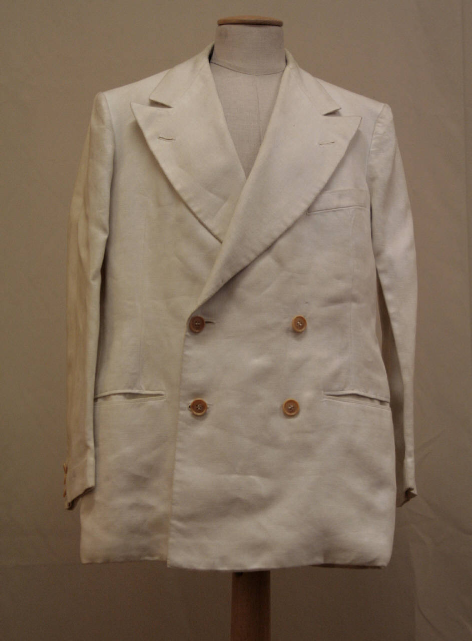 Completo composta da giacca e pantaloni in una variante di tela di lino (ogni colpi due orditi e due trame) bianco. Giacca doppiopetto, collo con risvolti a lancia con occhiell, abbottonaura con quattro occhielli e quattro bottoni, modellata da pinces, due tasche a filetto con patte e taschino co patta cucita sul petto, fianchetta e dorso con cucitura centrale. Maniche in due pezzi con spacco sulla manica con tre bottoni e altrettanti occhielli. Fodera parziale in diagonale di cotone bianche. Due tasche interne. Pantalone lungo classico con risvolto, con cintura con cinque pasanti, pinces aperte, tasche inserite nella cucitura dei fianchi e a filetto. Chiusura nascosta mediante patta dove sono quattro bottoni e altrettanti occhielli e un gancio; altri due bottoni sulla cintura. Etichetta applicata sulla fodera della tasca, lato sinistro.