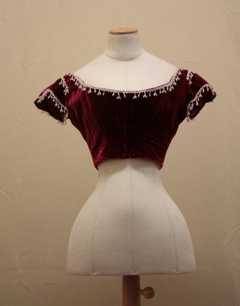 Corpino in velluto rosso granata, collo rotondo sottolineato da una frangia in perline di vetro trasparente e opaco, modellato da tagi e pense, vita dritta; dorso con vita modellata s punta, allacciatura centrale ottenuta da coppie di sete occhielli, maniche molto corte decorate come lo scollo. Doppiato in tela di lino écru, con nove stecche foderate con fettucia e nastro stringivita.