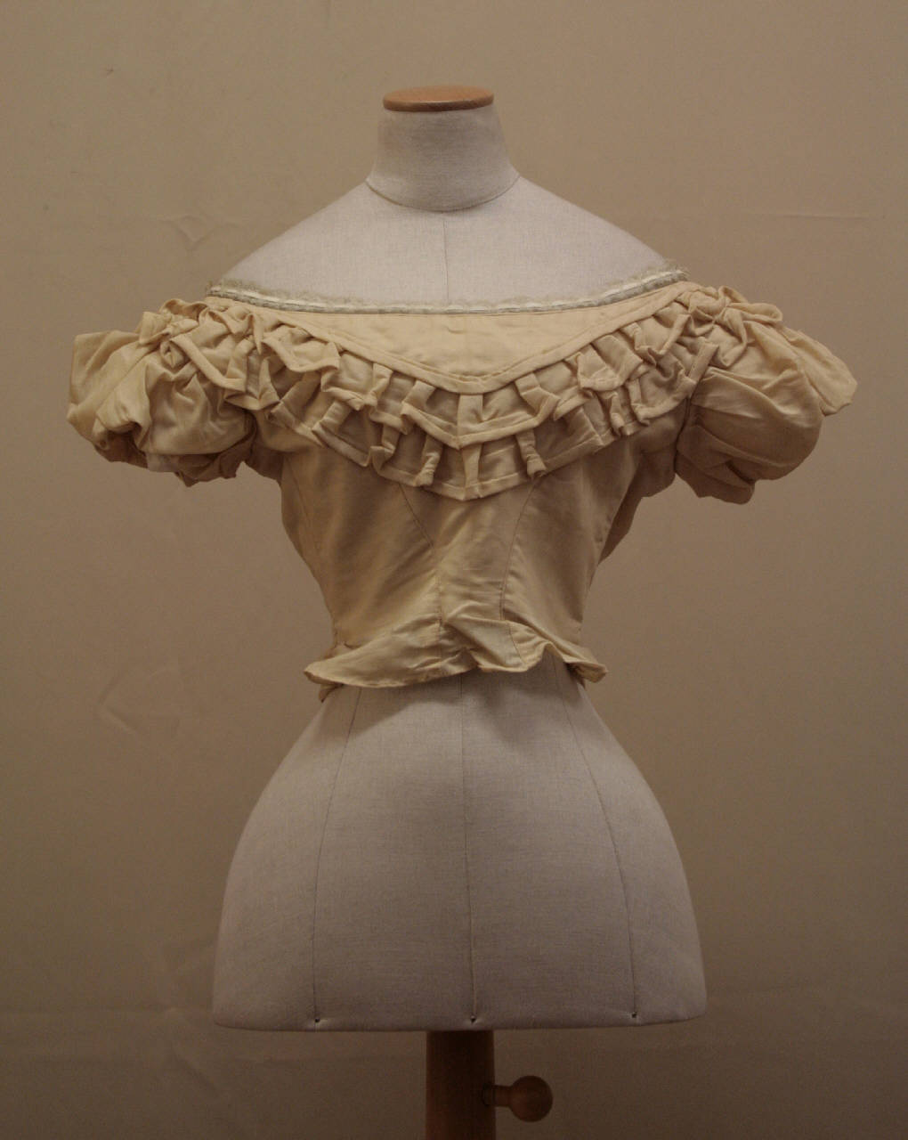 Corpino in tela di lana avorio, con scollo a barca, rifinito da una gala in crespo avorio e merletto in seta, su cui è stato fatto passare un nastro in raso avorio; modellato da tagli e pinces, con sprone arrotondato, da cui partono due gale arricciate degradanti, corte falde e abbottonatura completa al centro, data da cinque bottoni e altrettranti occhielli. Dorso con tagli struturato come il davanti Corte maniche arricciate e drappeggiate. Doppiato fino in vita in tela di lino avorio con sette stecche.