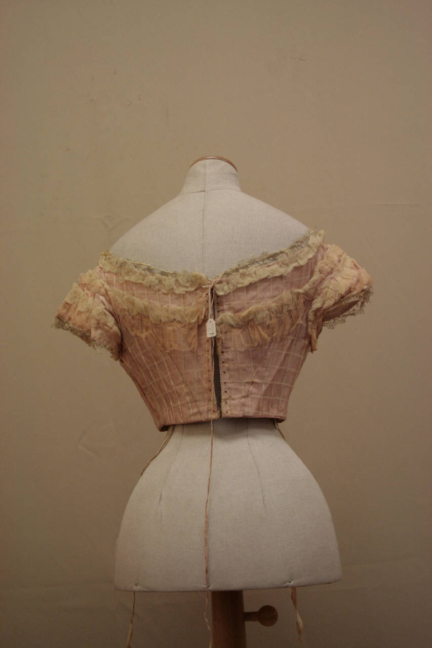 Corpino in garza operata, con fondo rosa e quadrettata in bianco, doppiata in tela di lino rosa, con scollo a barca bordato gale in tela di lino rada che ritorna anche sulle corte maniche, sul petto e sul dorso, strutturato da fianchetta e da pinces, vita dritta, al centro, poco sopra la vita, è un asola in seta. Dorso modellato da tagli, con allacciatura completa al centro, definita da una coppia di quattrordici occhielli. Doppiato internamente in tela di lino écru, su cui sono applicate le sette stecche foderate i tettuccia; una fettuccia è impiegata anche come stringivita.