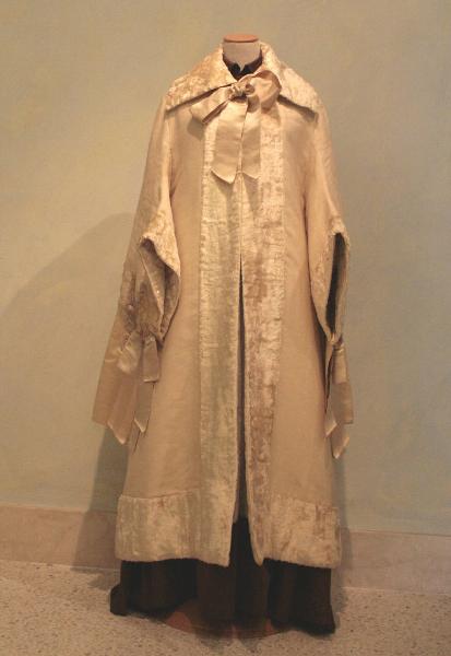 Il mantello è confezionato in tela di lana e seta bianco panna ed è impreziosito da un alto bordo in velluto peluche della stessa tonalità che corre sull'apertura anteriore, sul colletto, legato da un nastro di raso ton sur ton, e sull'orlo. Per tutta la sua ampiezza, la visite è decorata con un alta bordura in raso pieghettato e su ogni piega sono applicati dischi, disposti verticalmente in ordine prima crescente e poi decrescente, definiti da una spirale in cordoncino di seta e rifiniti da perline in vetro trasparente; dall'ultimo disco pende un fiocco in seta e perline di vetro. Fodera in raso imbottito.